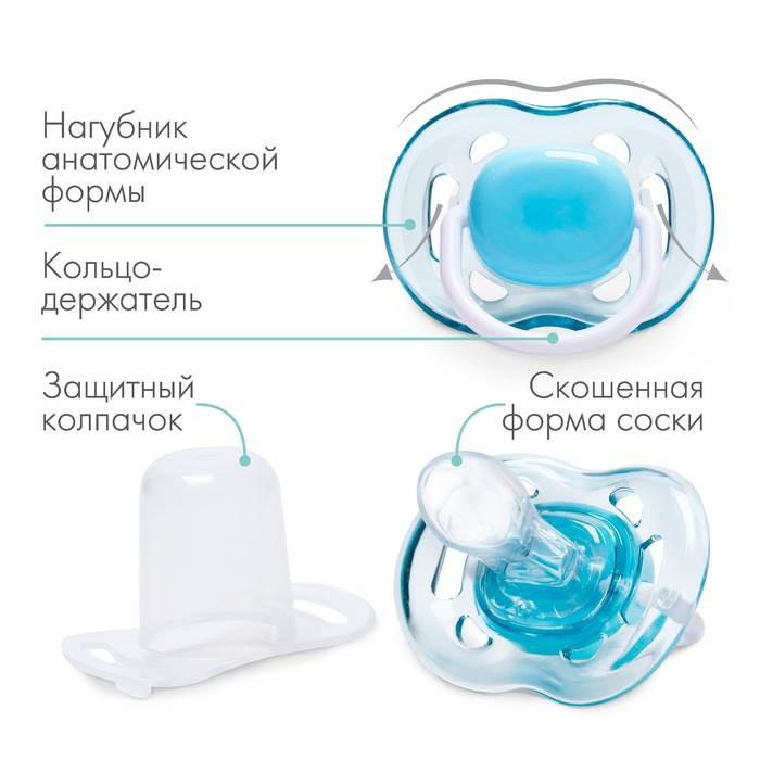 Соска - пустышка силиконовая ортодонтическая M&B, от 6 мес., с колпачком, голубой — Характеристики