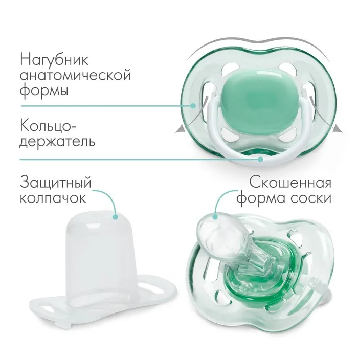 Соска - пустышка силиконовая ортодонтическая M&B, от 6 мес., с колпачком, зеленый — Характеристики