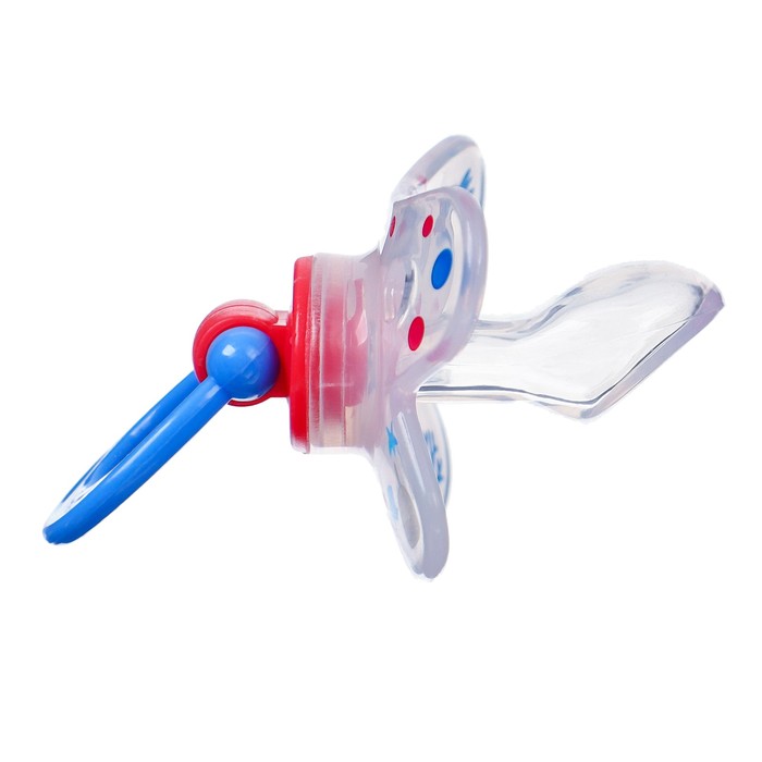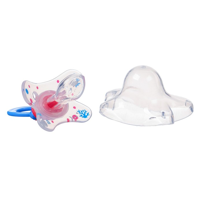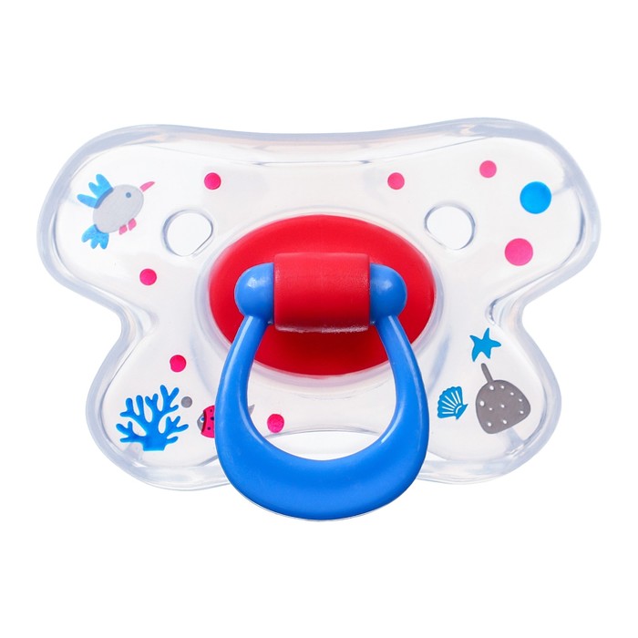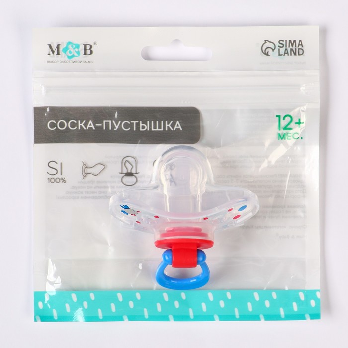 Соска - пустышка силиконовая ортодонтическая M&B «Зайка», от 12 мес., с колпачком, синий/красный — Характеристики