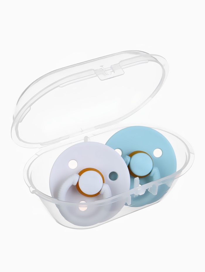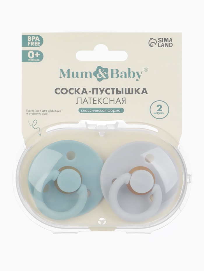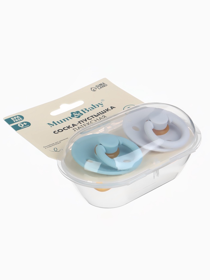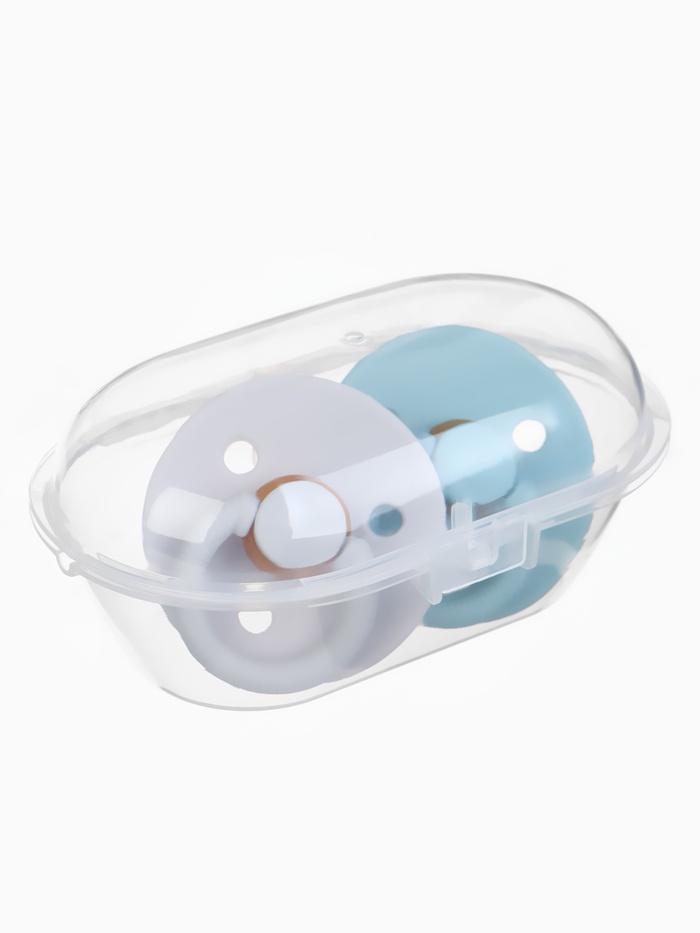 Соски-пустышки, от 0 мес., латекс, классические, в контейнере, набор из 2 шт., серо-синий/серый, M&B — Характеристики