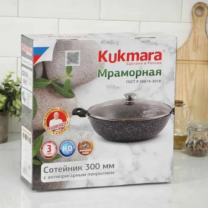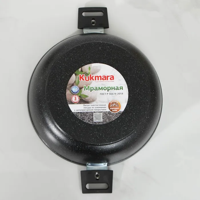 Посуда Kukmara «Мраморная» изготовлена из литого алюминия и покрыта инновационным антипригарным мраморным покрытием на водной основе, усиленным сверхтвёрдыми частицами минералов.