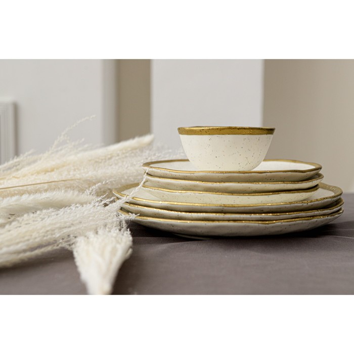Посуда серии Magistro Poursephona — это современная фарфоровая посуда. В оформлении серии превалируют два цвета – бежевый оттенок фарфора и роскошное золото в виде широкой окантовки предметов. Идеально подходит как для формального обеда, так и для торжеств по особым случаям. Лаконичные формы, золотая окантовка, разноцветные вкрапления придают изделиям из фарфора одновременно необычный и современный вид.
