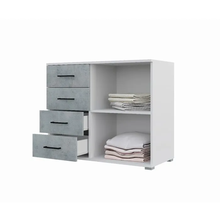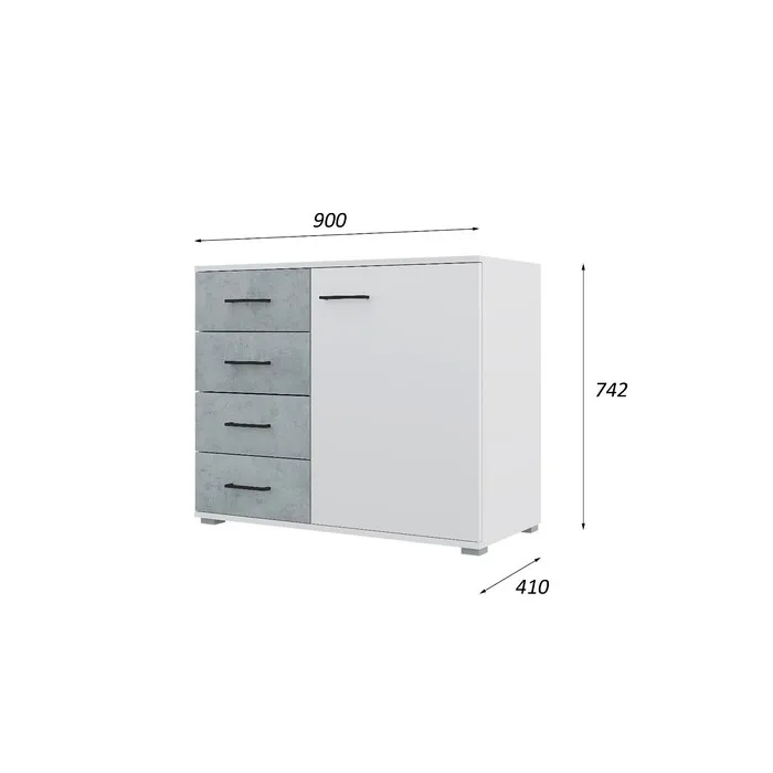 - Комод: 4 выдвижных ящика и ящик с распашной дверцей, оснащённый полкой. Размеры (ШхГхВ): 900 х 410 х 742.