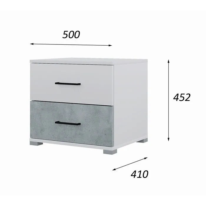 - Тумбы прикроватные (2 шт.) с двумя выдвижными ящиками. Размеры (ШхГхВ): 500 х 410 х 452.