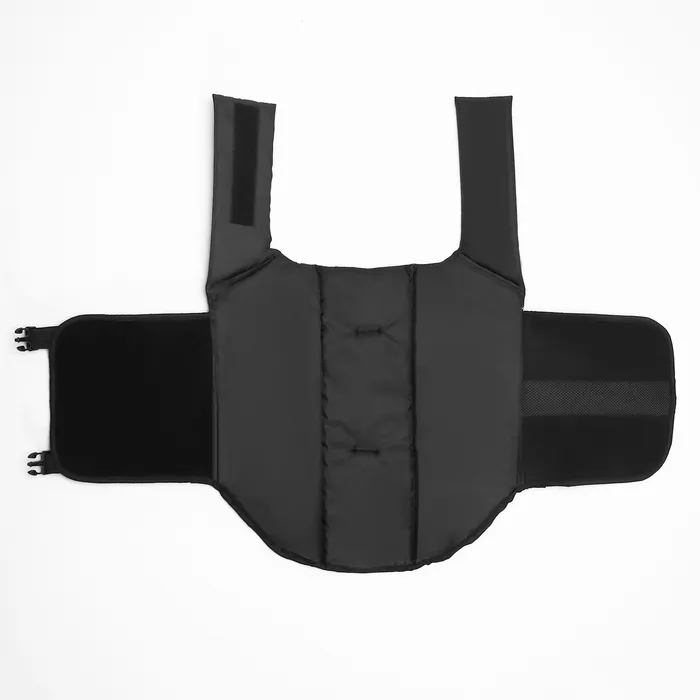 Жилет выполнен из качественных материалов: нейлон и пенополиэтилен, обеспечивает прочность и надежность жилета, крепеж из крепкого пластика не подвергается коррозии, что позволяет надежно зафиксировать жилет на собаке.