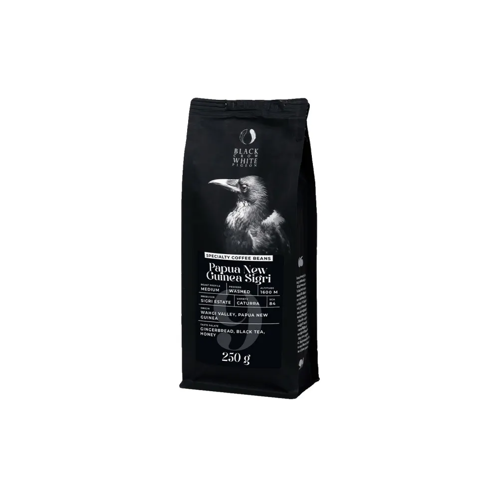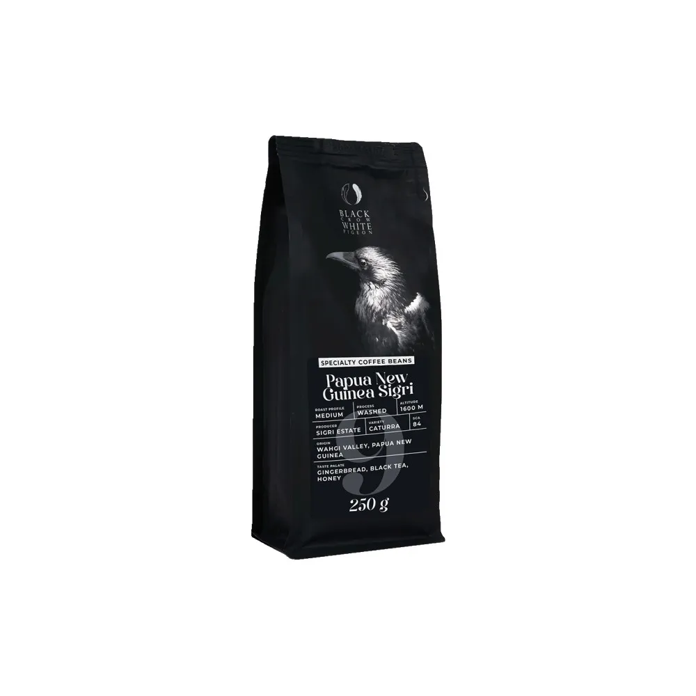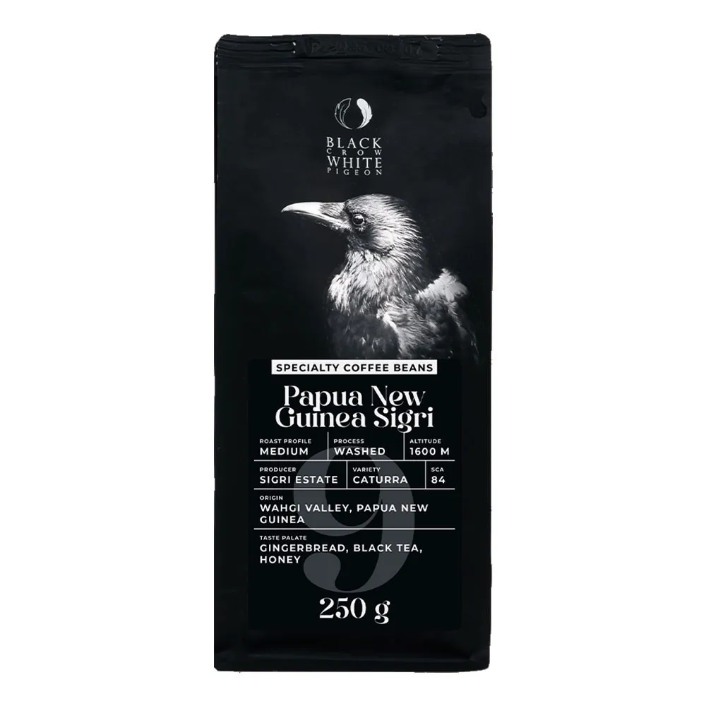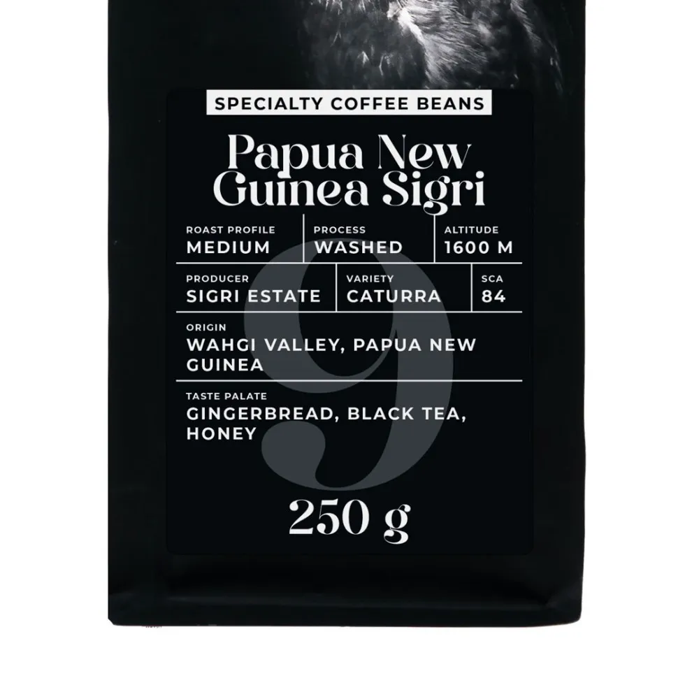 Этот кофе происходит из Папуа-Новой Гвинеи, региона Ваги, и выращивается на ферме Сигри. Высота над уровнем моря составляет 1600 метров, а сорт арабики - Катурра. Кофе обрабатывается промывочным методом и имеет среднюю обжарку. Его оценка - 84 балла из 100 по версии SCA. Вкусовой профиль включает имбирные пряники, черный чай и мед.