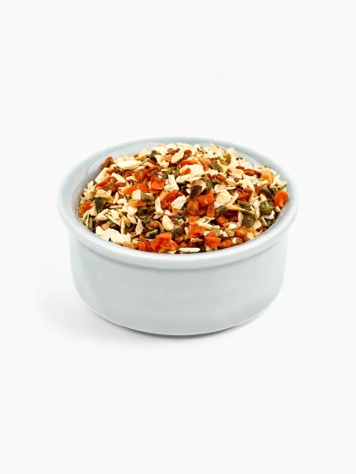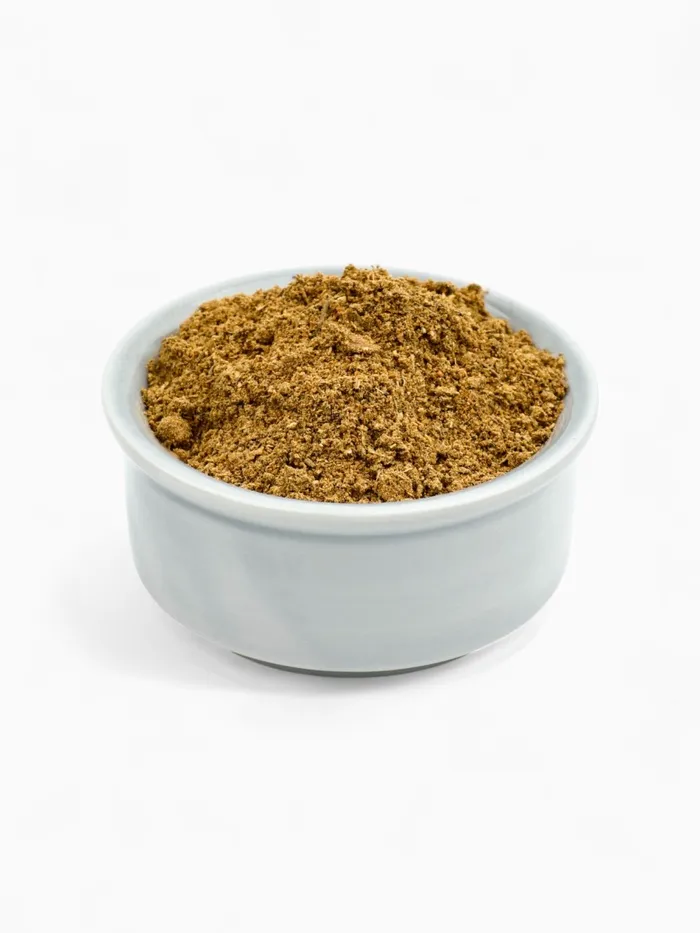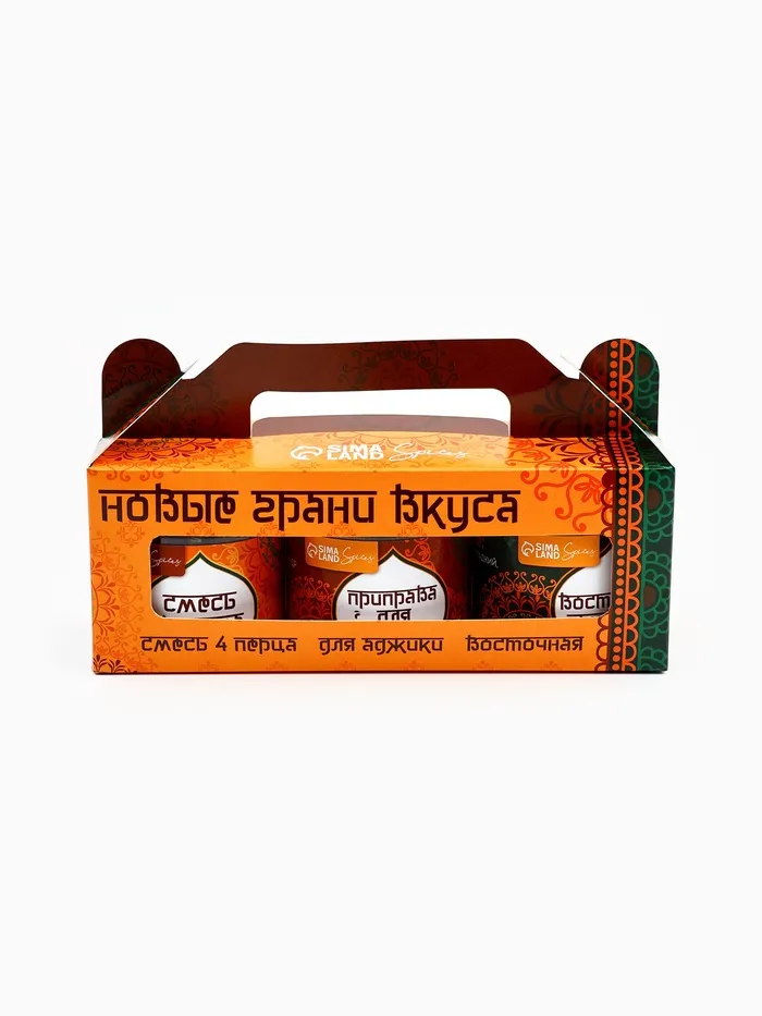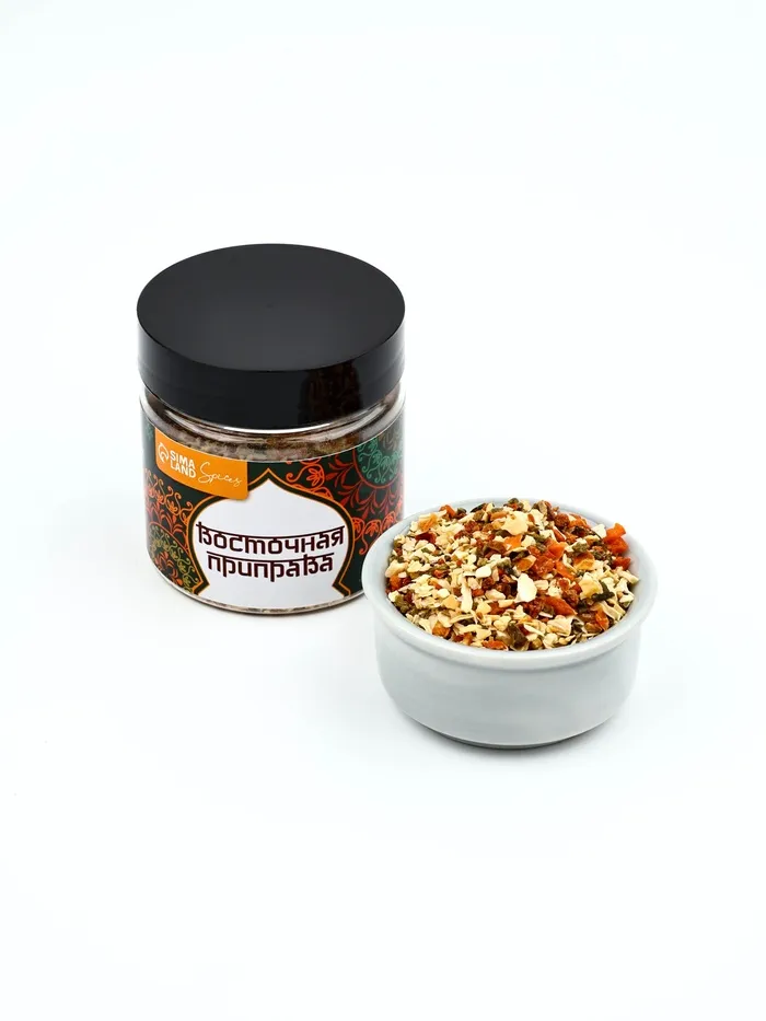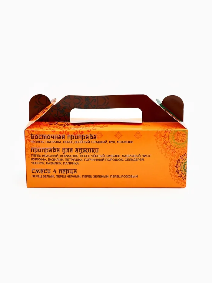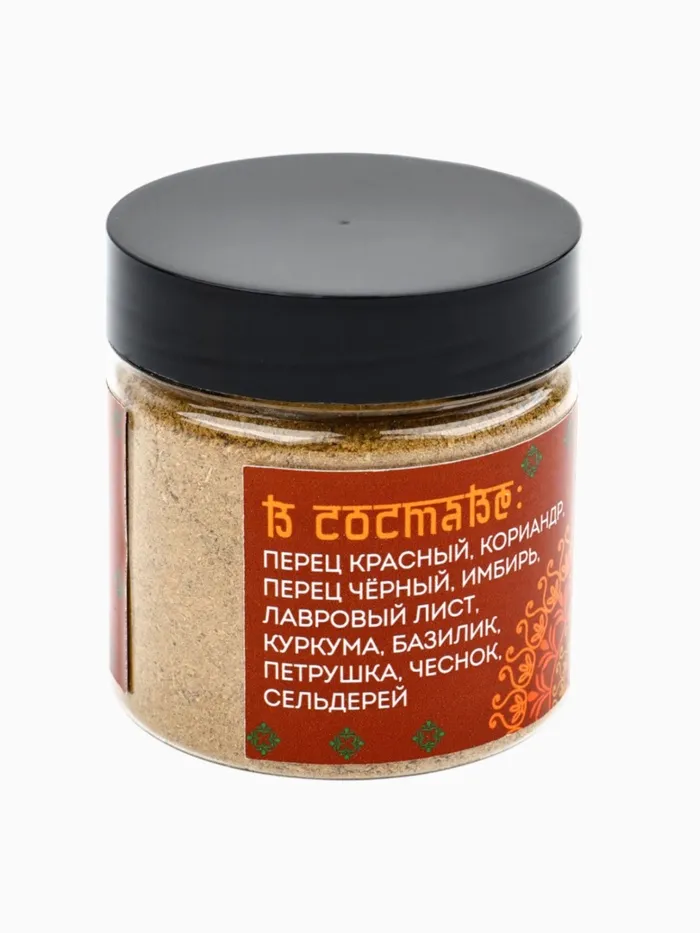 Состав: перец красный молотый, кориандр молотый, перец чёрный молотый, имбирь молотый, лавровый лист молотый, куркума молотая, базилик сушёный, петрушка (зелень), горочный порошок, сельдерей (зелень молотая), чеснок сушёный, базилик молотый, паприка красная молотая.