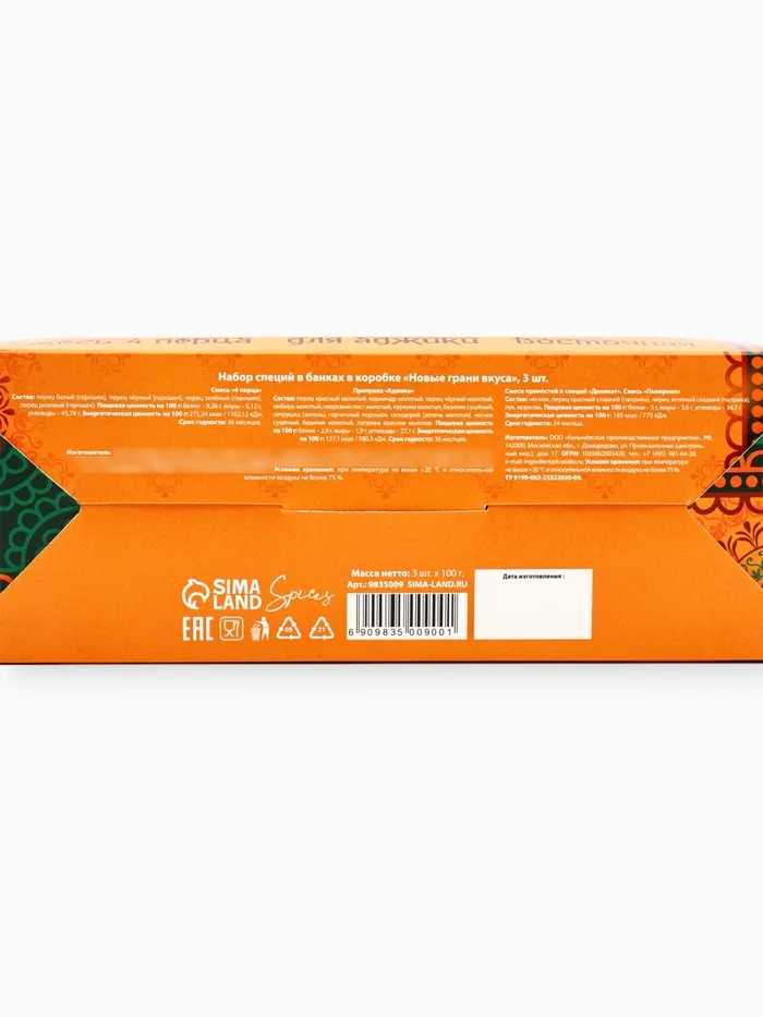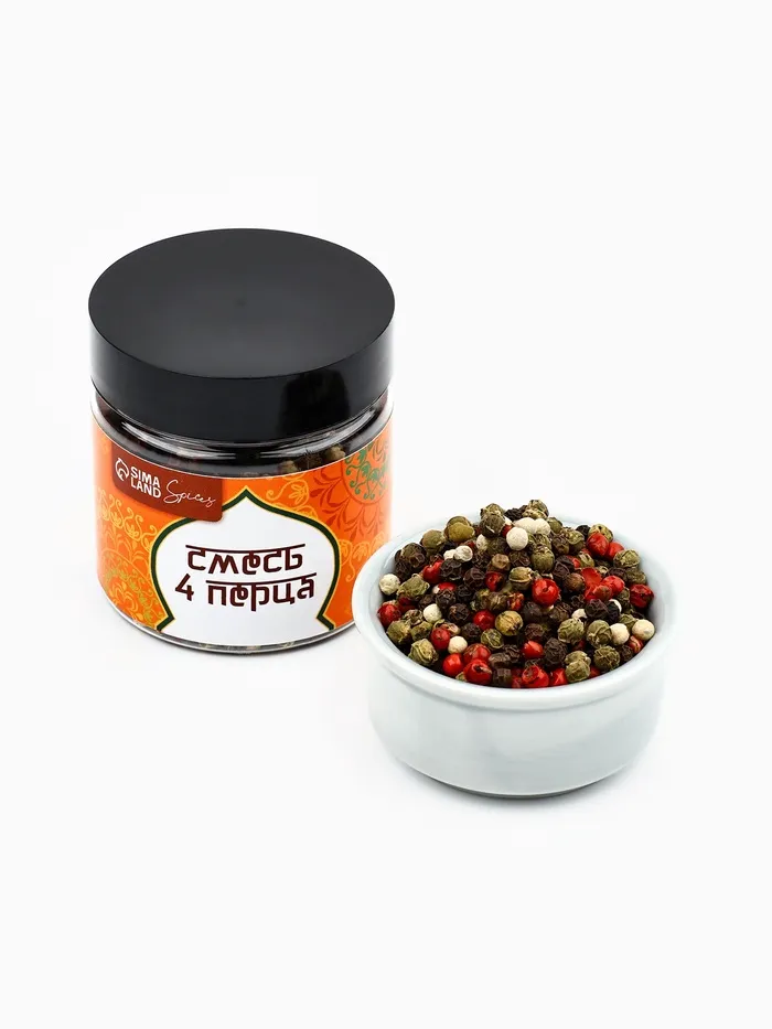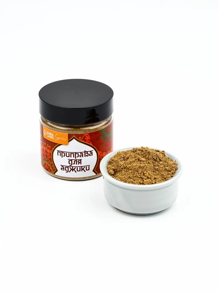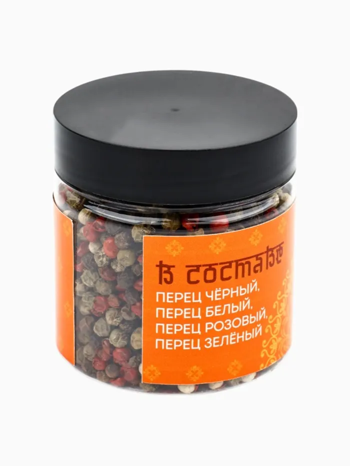 Состав: перец белый (горошек), перец чёрный (горошек), перец зелёный (горошек), перец розовый (горошек). Срок годности: 36 месяцев Приправа "Аджика"