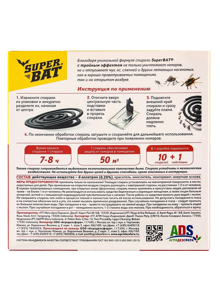Спирали от комаров SuperBat, тройной эффект, 10 шт. — Характеристики