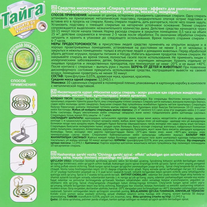 Угольные спирали от комаров Тайга предназначены для уничтожения летающих насекомых (комары, мошки, мокрецы, москиты). Спирали Тайга — оптимальное средство для защиты от комаров на открытом воздухе и в хорошо проветриваемых помещениях. Лучший вариант для отдыха на природе, в походе, на рыбалке или пикнике. Новая формула гарантирует 7-8 часов эффективного действия каждой спирали. Удобны и максимально просты в использовании. СОСТАВ — ДВ-трансфлутрин (0,03%), древесная уголь >30%, крахмал 15-30%.