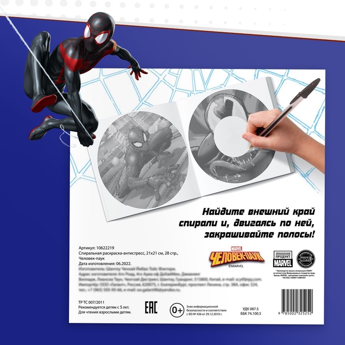 Спиральная раскраска - антистресс, 21×21 см, 28 стр., Человек - паук — Характеристики