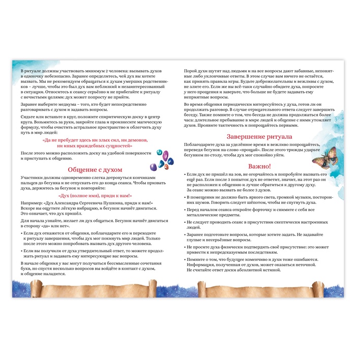 Настройтесь на связь с потусторонним миром, положите на стол спиритическую доску, зажгите свечи и погрузитесь в удивительный мир гаданий!