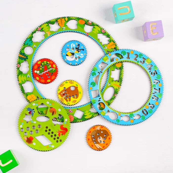 Спирограф — многофункциональная деревянная развивающая игрушка для рисования. Он имеет яркое оформление с тематическими изображениями, состоит из 2 зубчатых колёс с фигурными трафаретами и 5 кругов-шестерёнок.