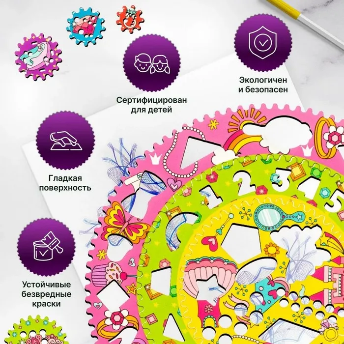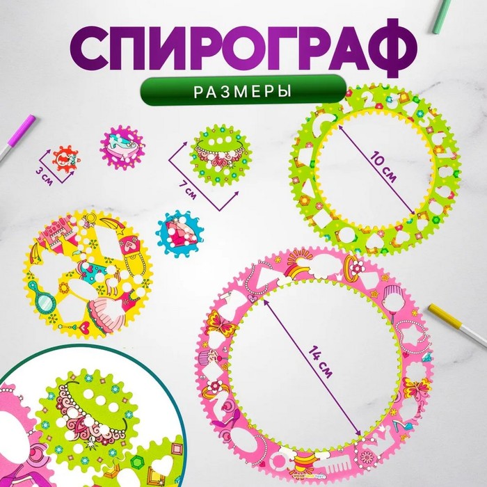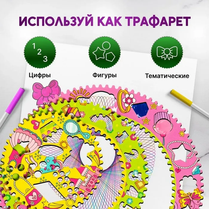 Спирограф — многофункциональная деревянная развивающая игрушка для рисования. Он имеет яркое оформление с тематическими изображениями, состоит из 2 зубчатых колёс с фигурными трафаретами и 5 кругов-шестерёнок.