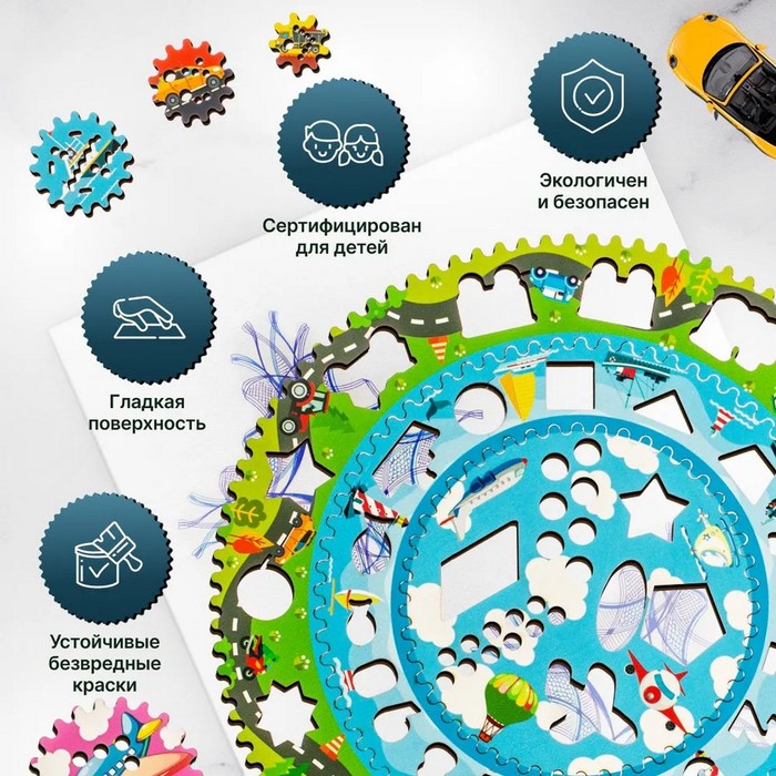 Спирограф «Транспорт» — это деревянный набор для творчества, который переносит детей в увлекательный мир машин, самолётов и кораблей через рисование. Благодаря простым правилам и ярким формам, он идеально подходит для мальчиков от 3 лет.