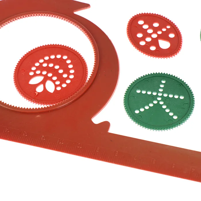 Спирограф — многофункциональная деревянная развивающая игрушка для рисования. Он имеет яркое оформление с тематическими изображениями, состоит из 2 зубчатых колёс с фигурными трафаретами и 5 кругов-шестерёнок.