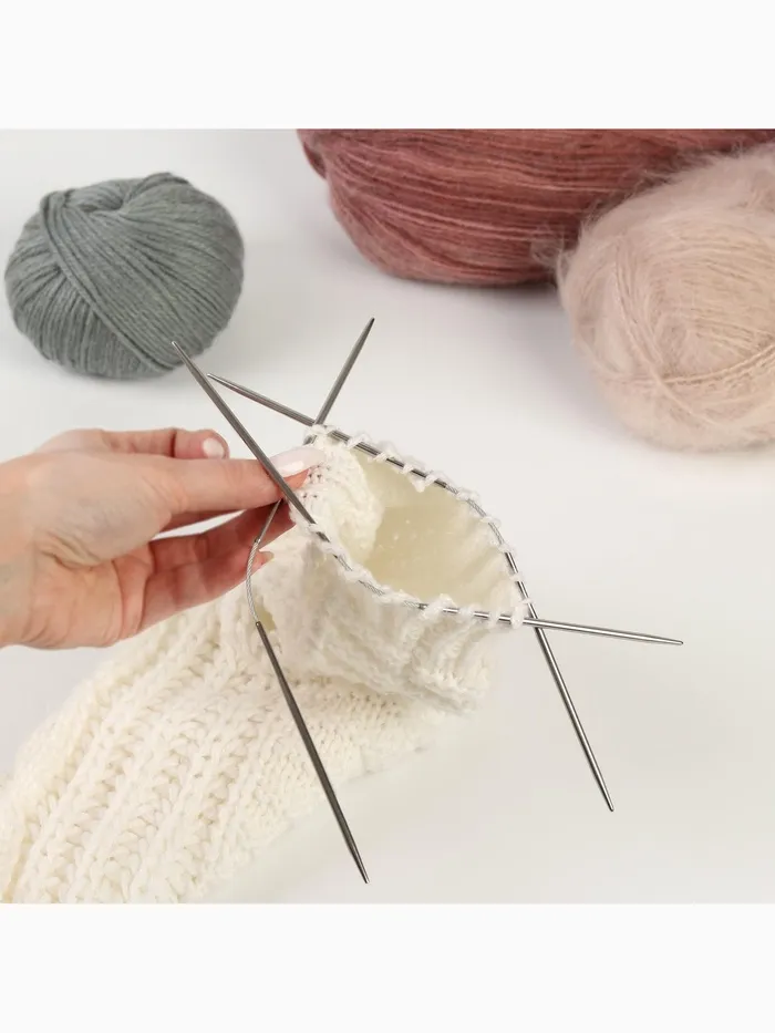 Гибкие спицы идеально подходят для изделий небольшого размера: носков, варежек, гольф. Петли распределяются по двум спицам и провязываются при помощи третьей спицы, таким образом уменьшается количество переходов. И за счёт этого ускоряется процесс вязания. Гибкие спицы также можно использовать в качестве вспомогательных при вывязывании кос.