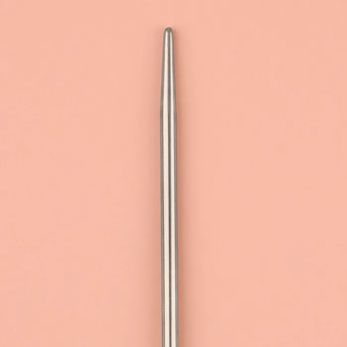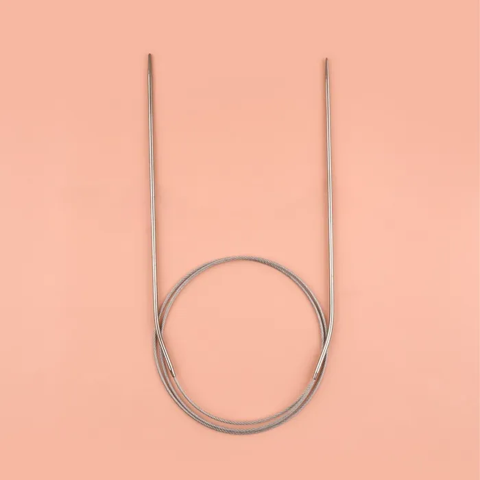 Круговые спицы представляют собой две металлические части, соединённые друг с другом тросиком. Инструмент незаменим при вязании полотна по кругу. С его помощью получаются изделия без дополнительных швов: шапки, рукава и горловины.