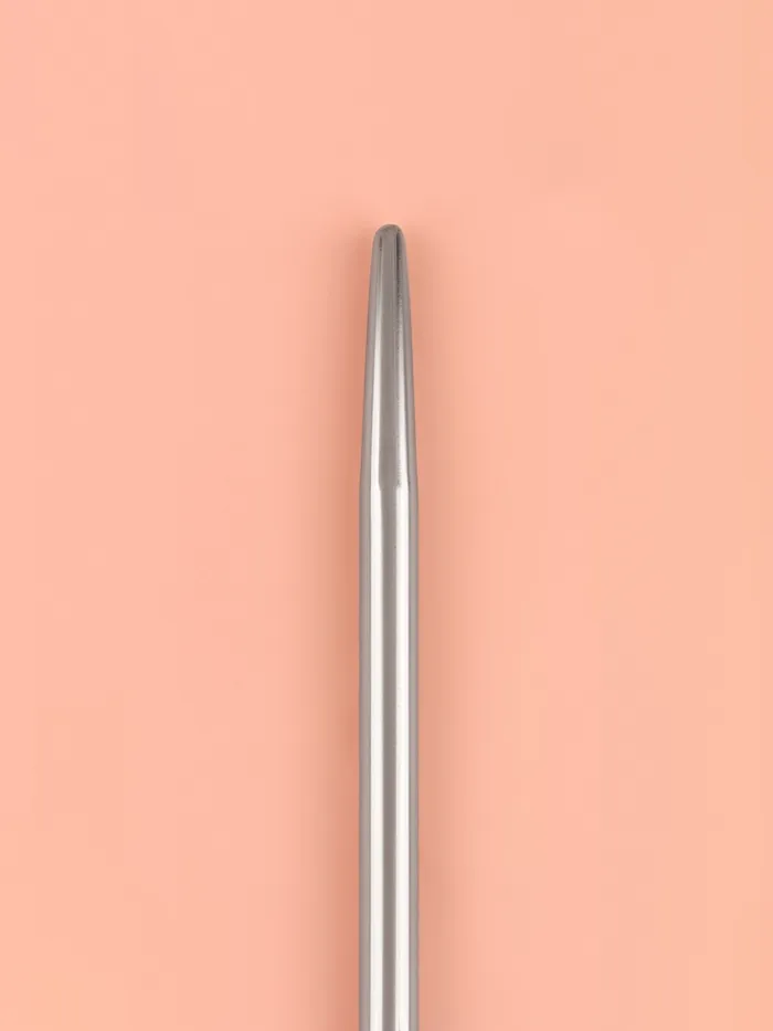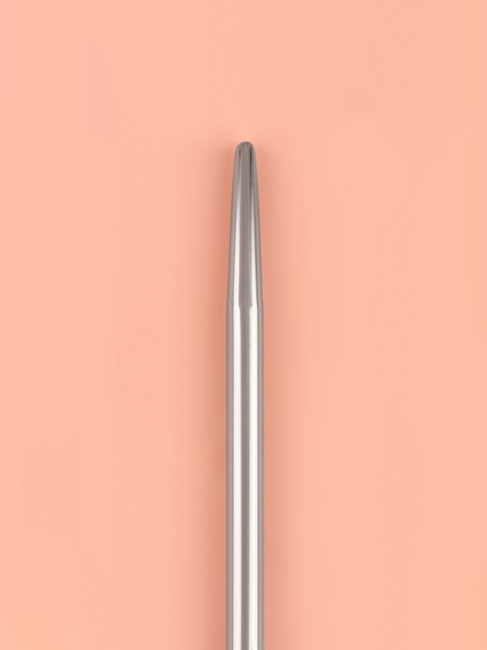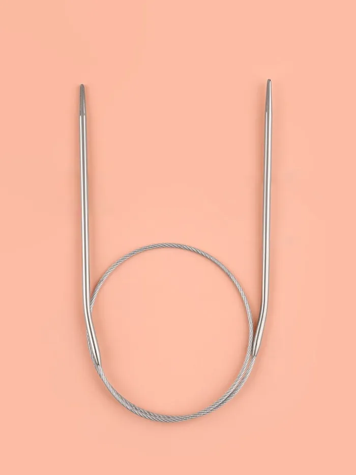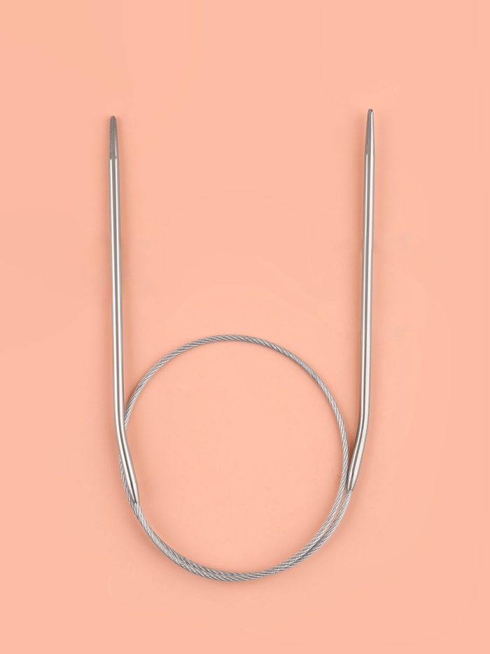 Круговые спицы представляют собой две металлические части, соединённые друг с другом тросиком. Инструмент незаменим при вязании полотна по кругу. С его помощью получаются изделия без дополнительных швов: шапки, рукава и горловины.
