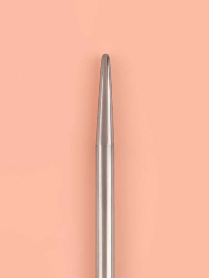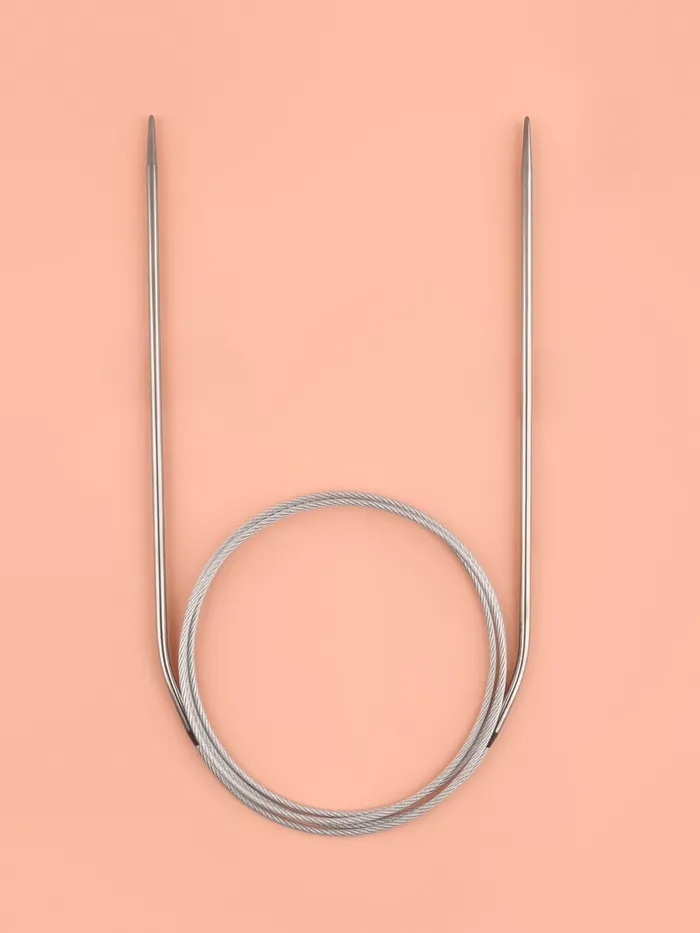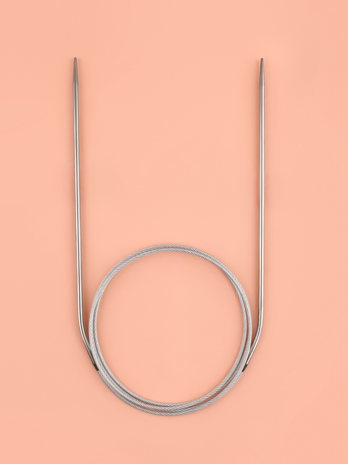 Круговые спицы представляют собой две металлические части, соединённые друг с другом тросиком. Инструмент незаменим при вязании полотна по кругу. С его помощью получаются изделия без дополнительных швов: шапки, рукава и горловины.
