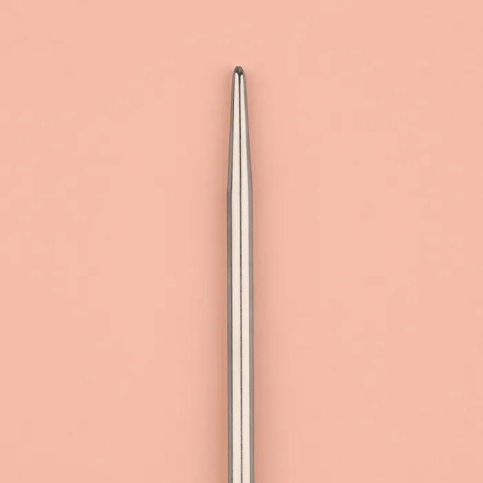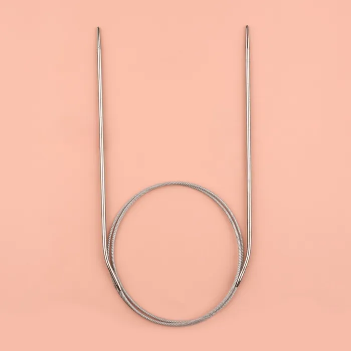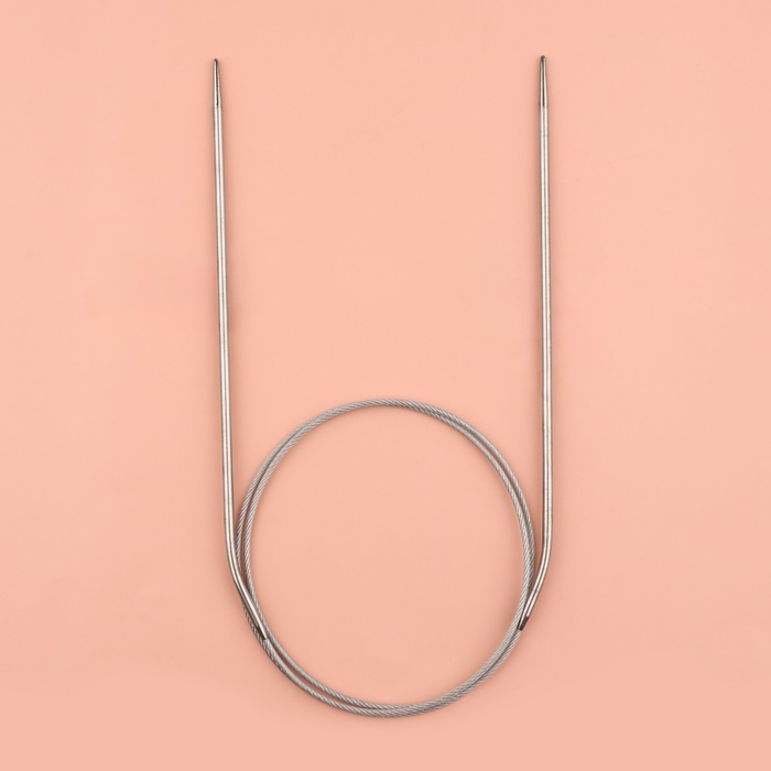 Круговые спицы представляют собой две металлические части, соединённые друг с другом тросиком. Инструмент незаменим при вязании полотна по кругу. С его помощью получаются изделия без дополнительных швов: шапки, рукава и горловины.
