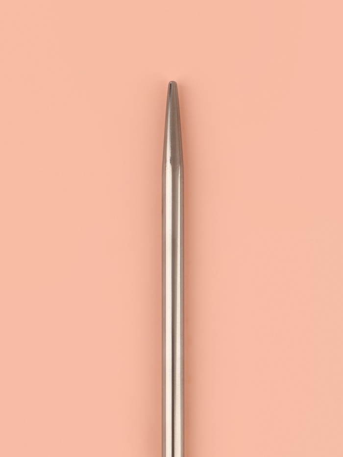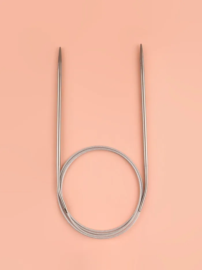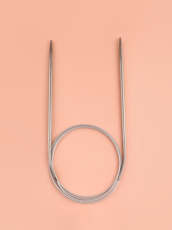 Круговые спицы представляют собой две металлические части, соединённые друг с другом тросиком. Инструмент незаменим при вязании полотна по кругу. С его помощью получаются изделия без дополнительных швов: шапки, рукава и горловины.