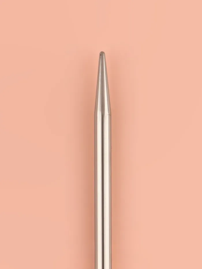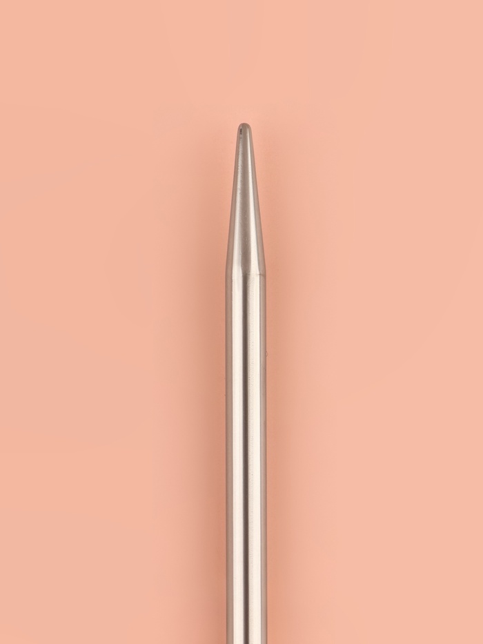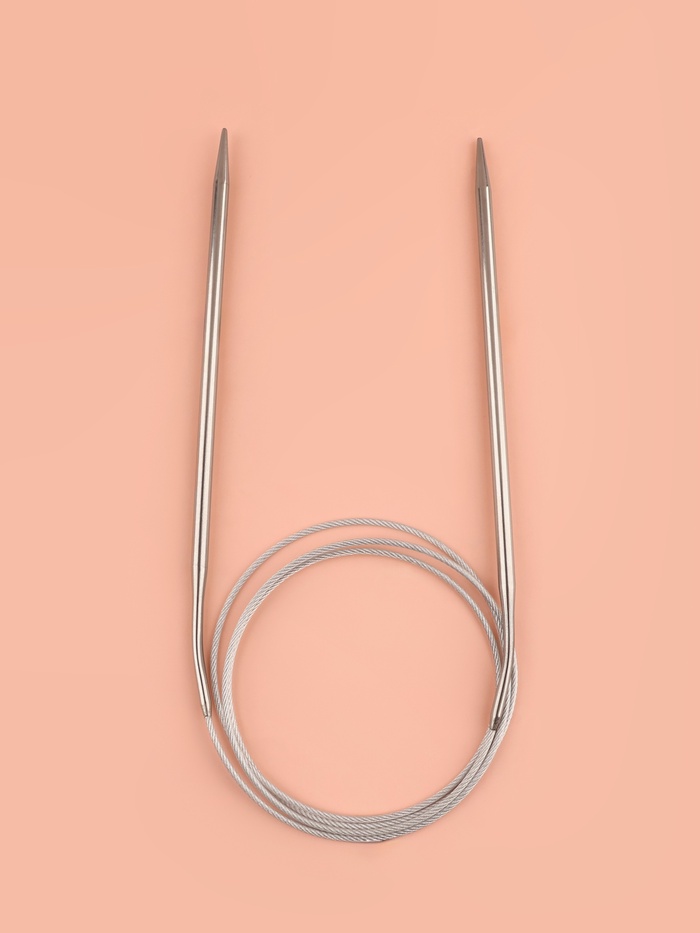 Круговые спицы представляют собой две металлические части, соединённые друг с другом тросиком. Инструмент незаменим при вязании полотна по кругу. С его помощью получаются изделия без дополнительных швов: шапки, рукава и горловины.