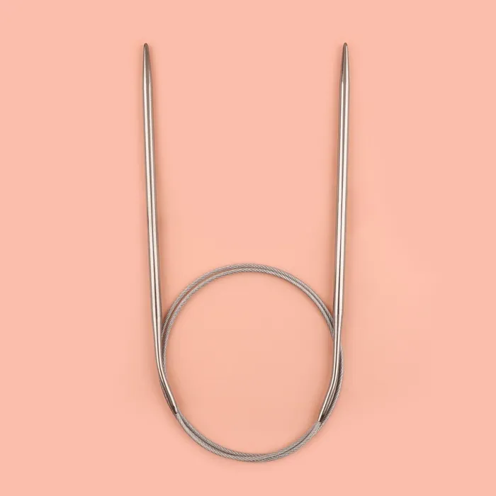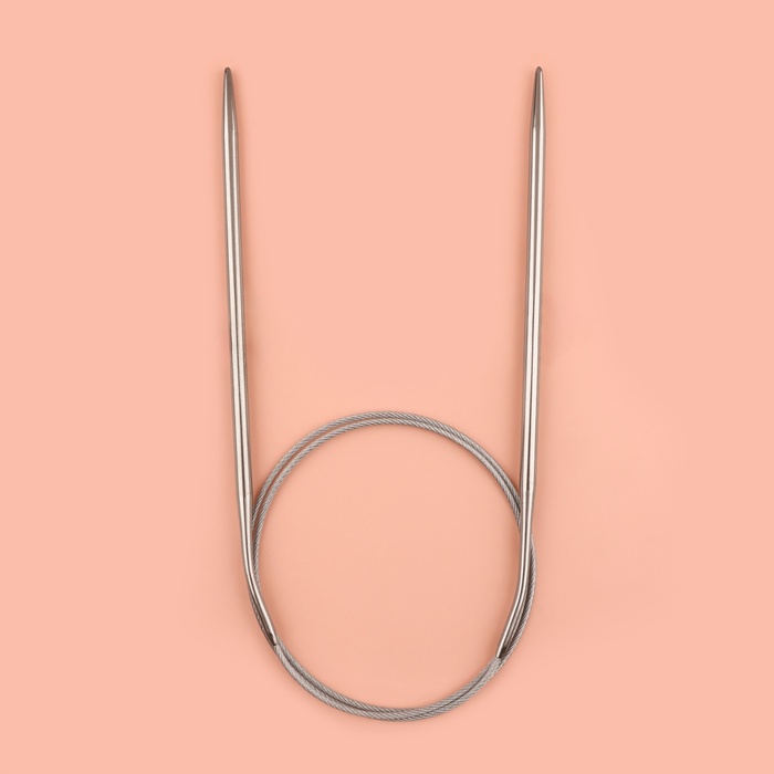 Круговые спицы представляют собой две металлические части, соединённые друг с другом тросиком. Инструмент незаменим при вязании полотна по кругу. С его помощью получаются изделия без дополнительных швов: шапки, рукава и горловины.