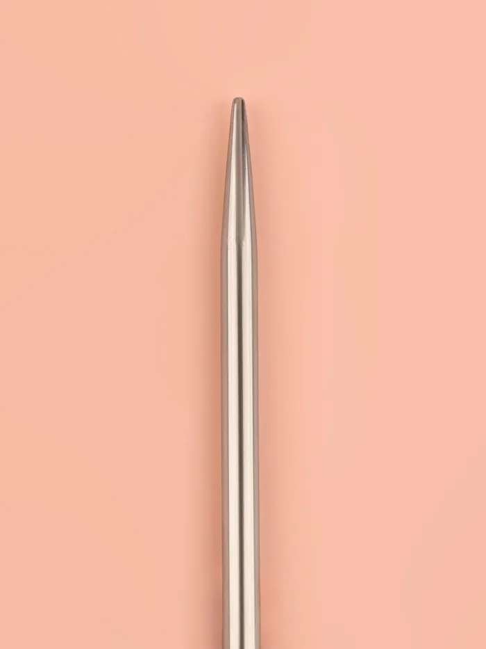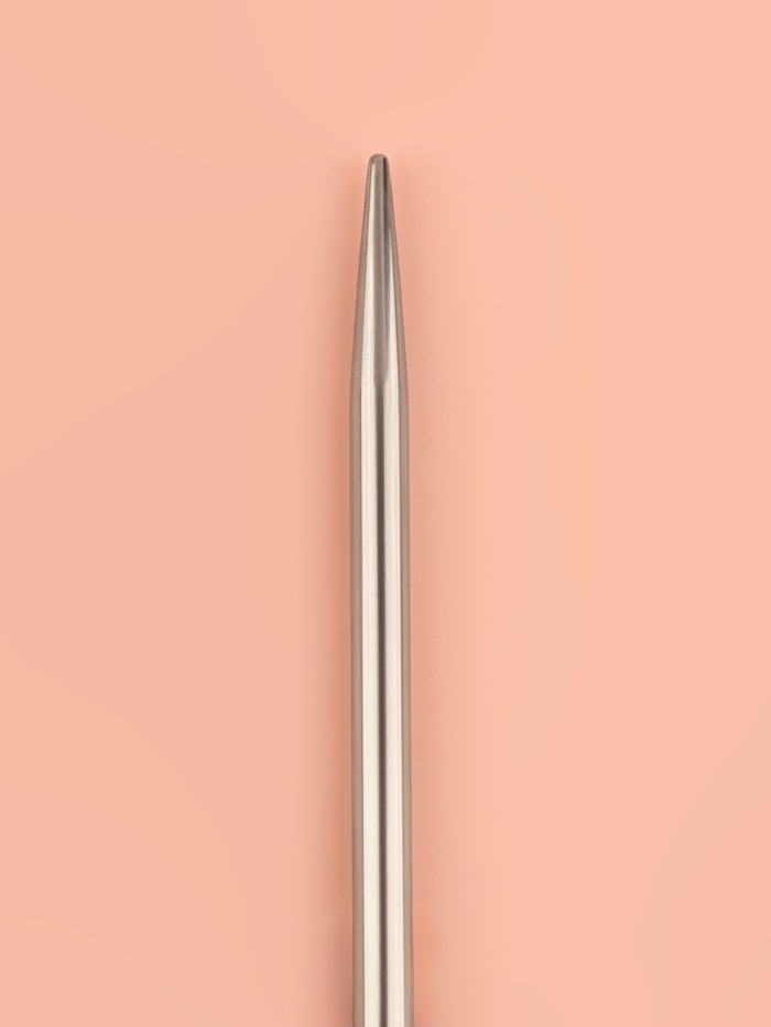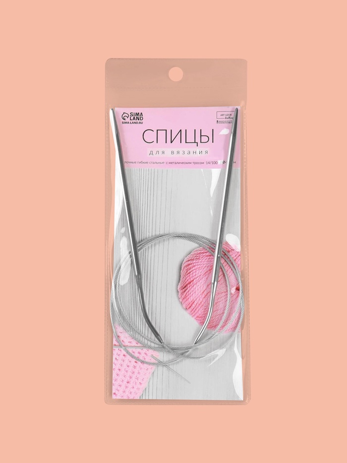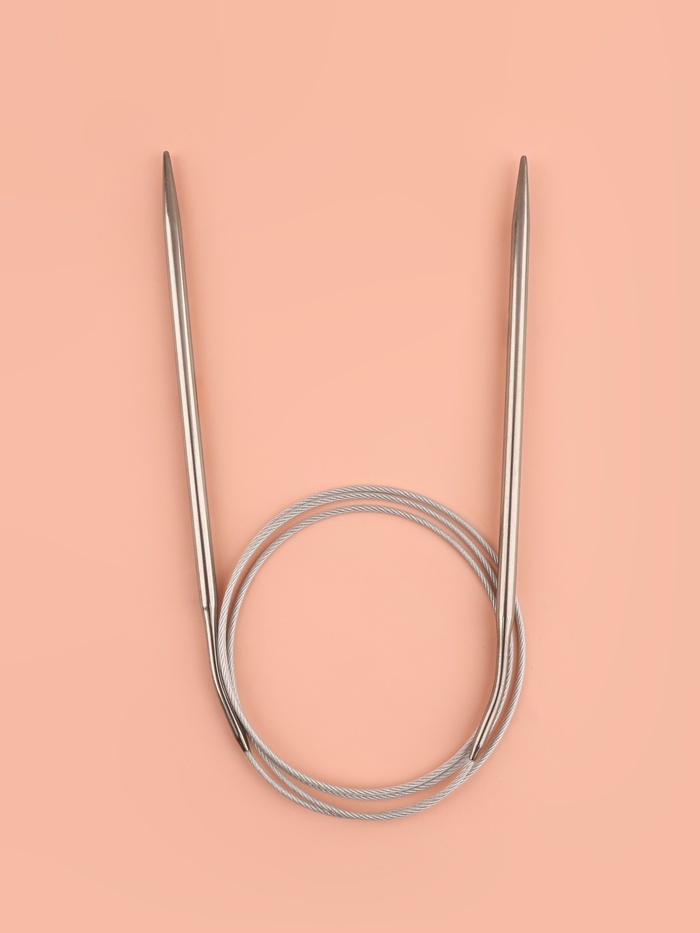 Круговые спицы представляют собой две металлические части, соединённые друг с другом тросиком. Инструмент незаменим при вязании полотна по кругу. С его помощью получаются изделия без дополнительных швов: шапки, рукава и горловины.