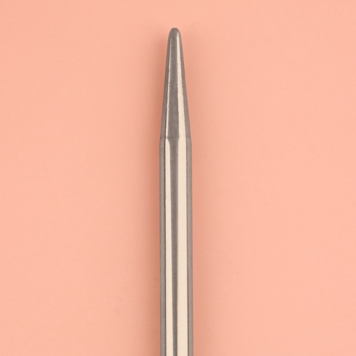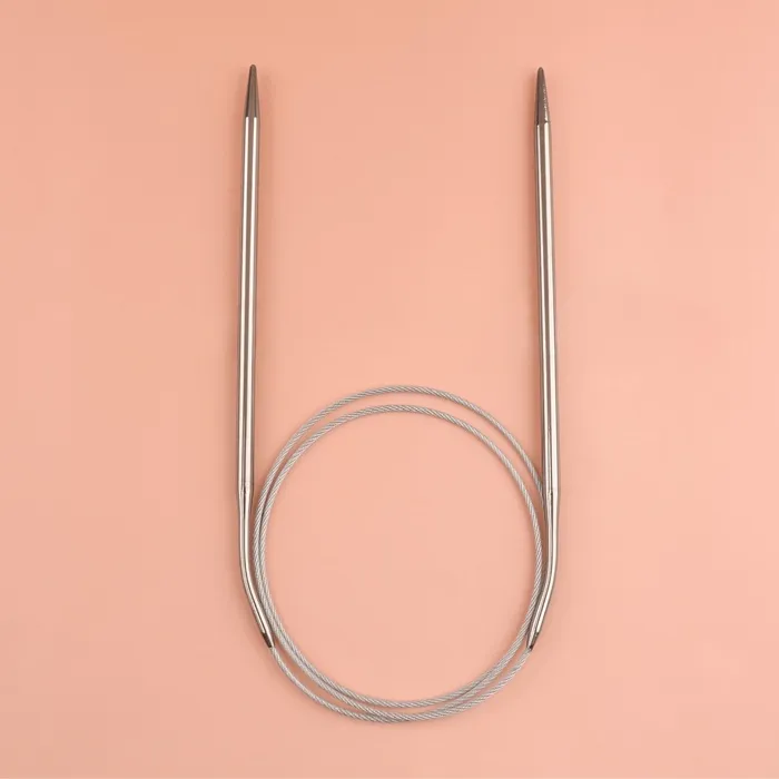 Круговые спицы представляют собой две металлические части, соединённые друг с другом тросиком. Инструмент незаменим при вязании полотна по кругу. С его помощью получаются изделия без дополнительных швов: шапки, рукава и горловины.