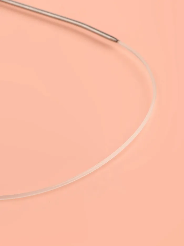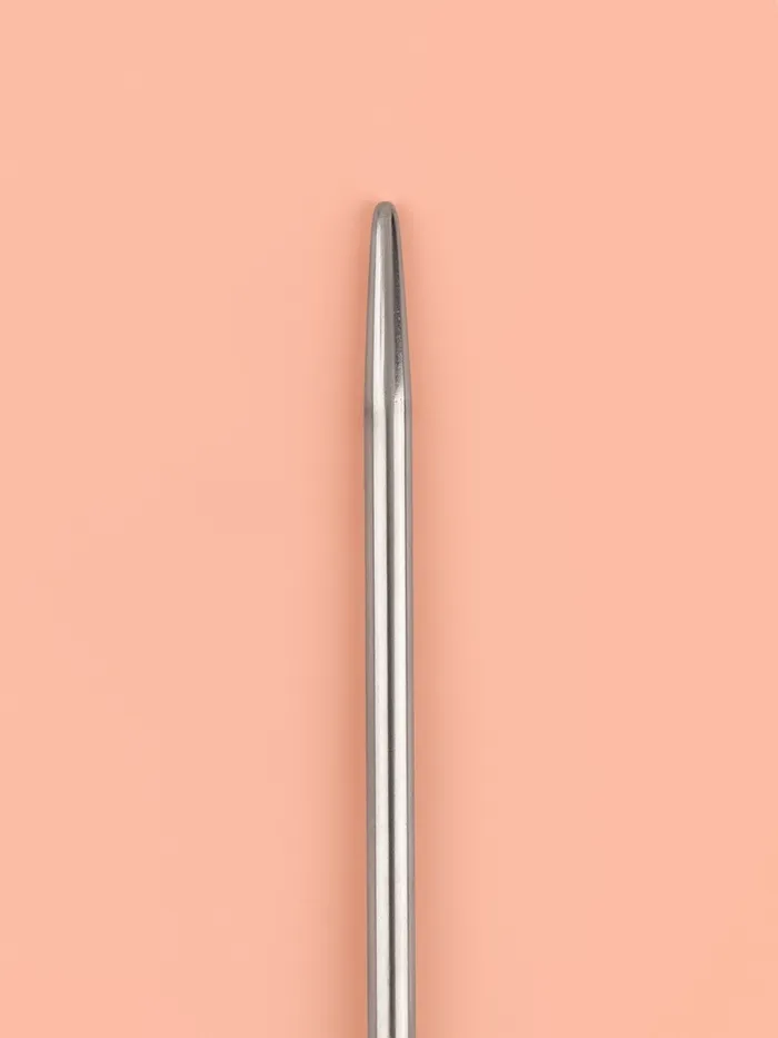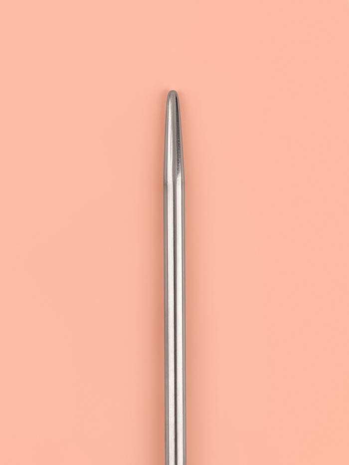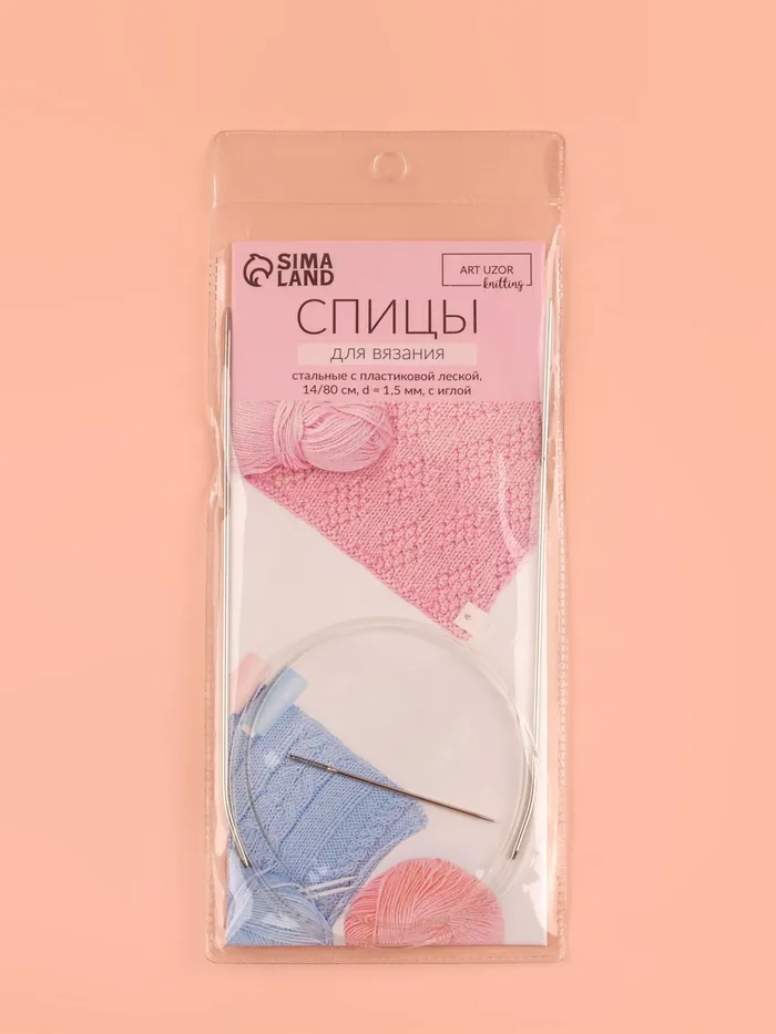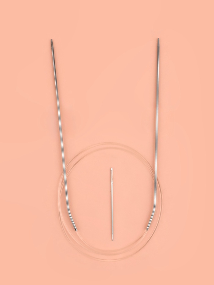 Круговые спицы представляют собой две металлические части, соединённые тросиком. Инструмент незаменим при вязании полотна по кругу, так как с его помощью получаются изделия без дополнительных швов: шапка, рукав, горловина. А иголка пригодится, чтобы соединить между собой готовые части вещей.