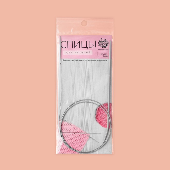 Круговые спицы представляют собой две металлические части, соединённые друг с другом тросиком. Инструмент незаменим при вязании полотна по кругу. С его помощью получаются изделия без дополнительных швов: шапки, рукава и горловины.