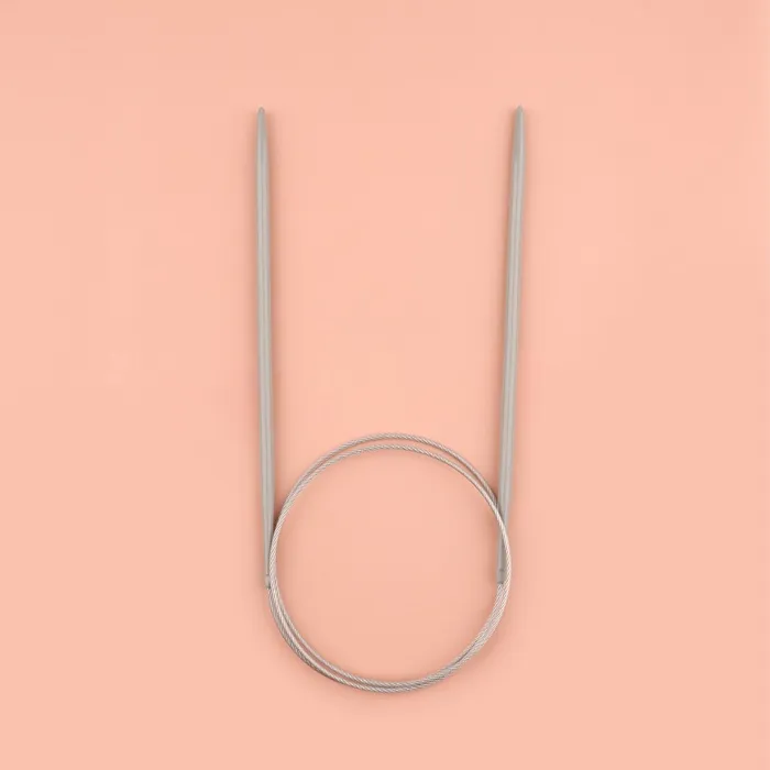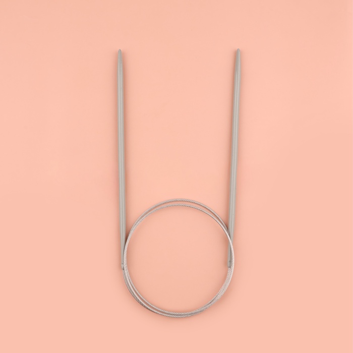 Круговые спицы представляют собой две металлические части, соединённые друг с другом тросиком. Инструмент незаменим при вязании полотна по кругу. С его помощью получаются изделия без дополнительных швов: шапки, рукава и горловины.