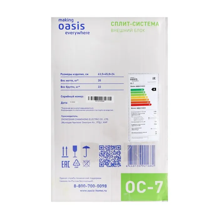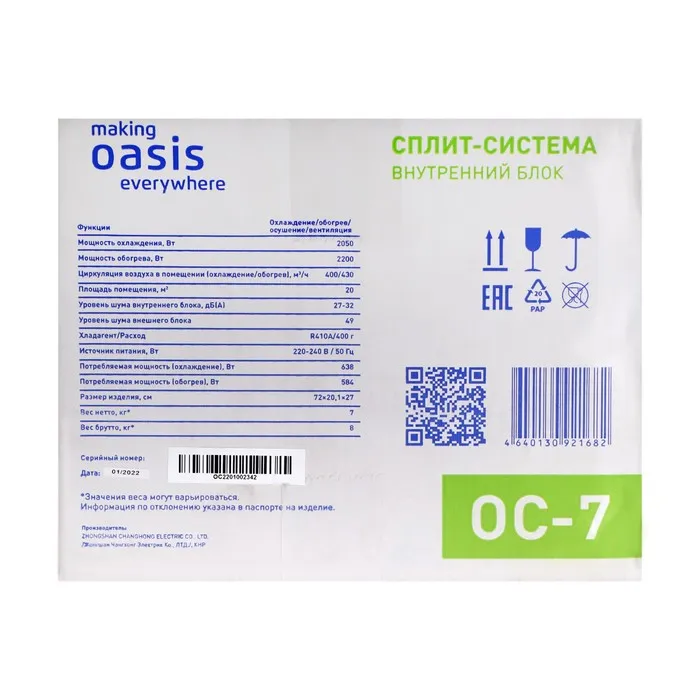 Сплит-система Making Оasis everywhere OC-7, 2.2 кВт, 20 м2, класс А, белая — Характеристики