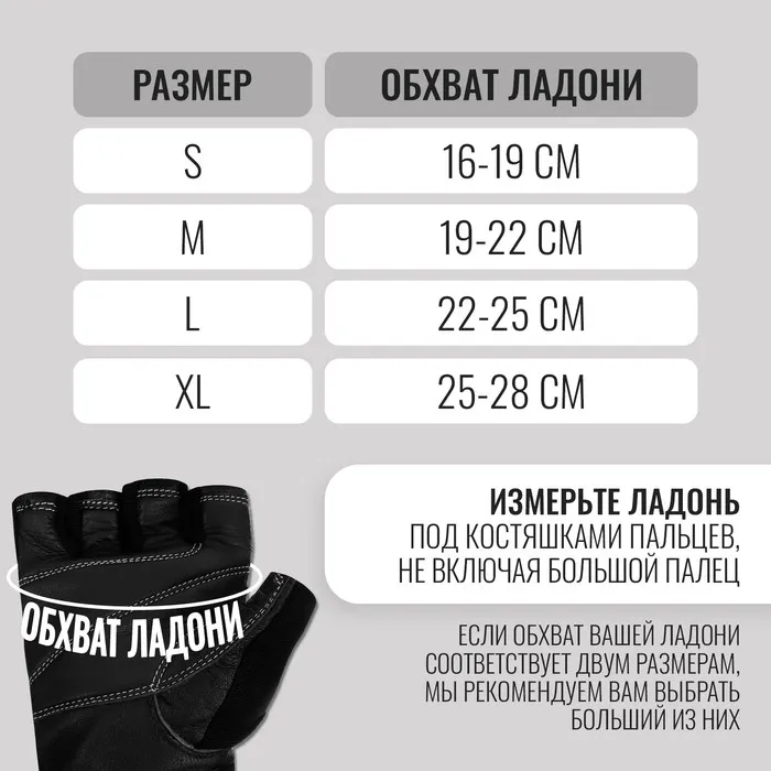 Измерьте сантиметровой лентой обхват ладони по самой широкой части непосредственно под костяшками пальцев (не включая большой палец). Наши перчатки должны плотно прилегать к руке. Если Вы находитесь между двумя размерами, рекомендуем выбрать больший из двух размеров.