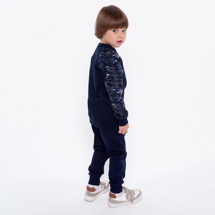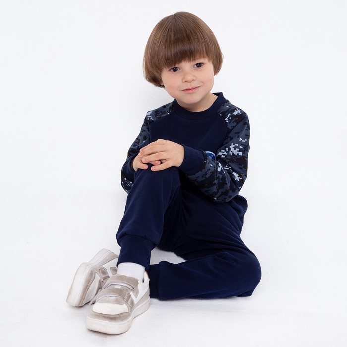 Спортивный костюм для мальчика в тёмно-синем камуфляже — это тёплый комплект из толстовки и брюк. Комплект из мягкого хлопкового футера подходит для школы, прогулок и отдыха в прохладную погоду.