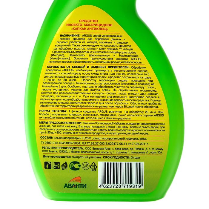Универсальный спрей Argus — готовое средство для защиты дачных и садовых участков от клещей, муравьёв и садовых вредителей. Также рекомендуем использовать его для обработки палаток, тентов и мест пикника от клещей. Средство эффективно уничтожает представителей родов ixodes, dermacenlor и haemaphysalis.