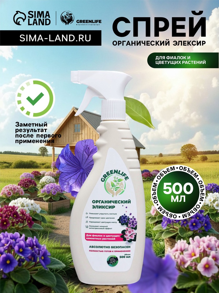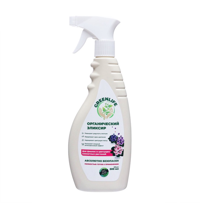 ""Спрей "Green Life""" представляет собой органический эликсир, разработанный специально для ухода за ""фиалками и другими цветущими комнатными растениями"". Объем флакона составляет 0,5 литра, что обеспечивает достаточное количество средства для обработки нескольких растений.