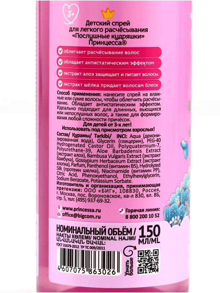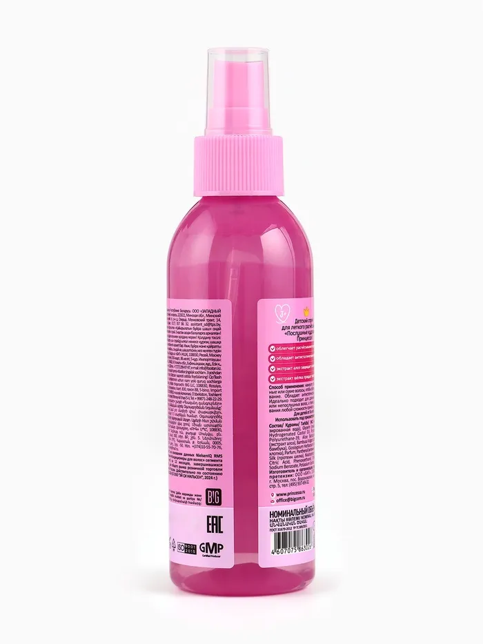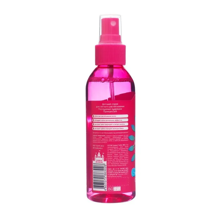 Благодаря спрею для волос уход за волосами станет настоящим удовольствием для маленькой принцессы. Процесс расчёсывания отныне становится лёгким, локоны послушными и блестящими. Лёгкий цветочный аромат придаст особую нежность образу маленькой красавицы. Спрей для волос – не смываемый продукт. Он является прекрасным дополнением к шампуню и бальзаму для волос, его можно наносить на сухие и влажные волосы.