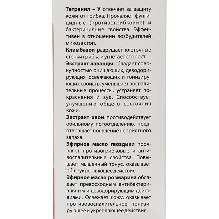 Спрей предназначен для ежедневного ухода и защиты кожи ног и ногтей, а также для профилактической обработки обуви. Входящие в состав активные компоненты оказывают антибактериальное и противогрибковое действие.
