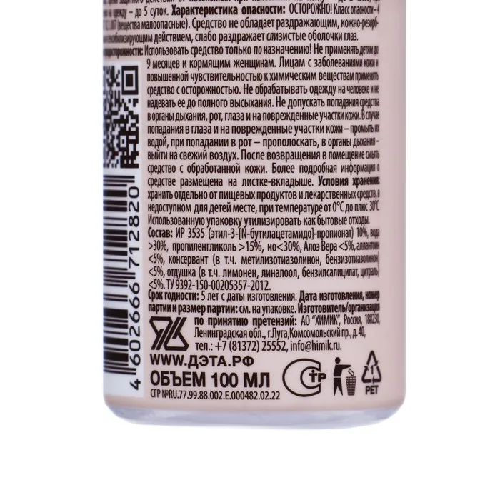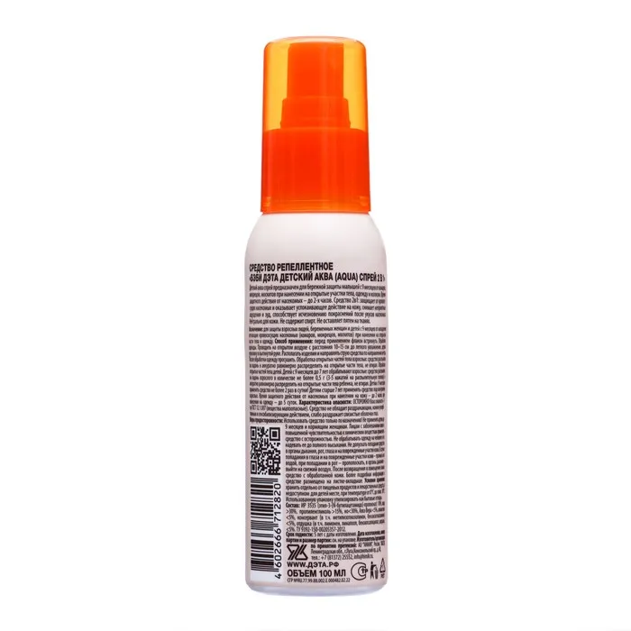 СоставИР 3535 (этил-3-[N-бутилацетамидо]-пропионат) 10%, вода >30%, пропиленгликоль>15%, но < 30%, Алоэ Вера < 5%, аллантоин < 5%, консервант (в т.ч. метилизотиазолинон, бензизотиазолинон)< 5%, отдушка (в т.ч. лимонен, линалоол, бензилсалицилат, цитраль) < 5%.Инструкция по применениюНажимая пальцем на распылительную головку, нанесите средство на ладонь и, не втирая, равномерно обработайте открытые участки тела: лицо, руки, шею, ноги.Обработку одежды и других изделий из тканей производите с расстояния 10-15 см до легкого увлажнения.Располагайте одежду и направляйте струю средства по направлению ветра.Описание«ДЭТА АКВА (AQUA) спрей для чувствительной кожи» специально разработан для бережной и щадящей защиты взрослых и детей с 9 месяцев при нанесении на открытые части тела, одежду и другие изделия из ткани.Эффективно защищает от укусов комаров, москитов и мокрецов при нанесении на кожу в течение 2-х часов.Благодаря рецептуре на водной основе «ДЭТА АКВА (AQUA) спрей для чувствительной кожи» не сушит и не раздражает кожные покровы, а входящий в состав Алоэ Вера ухаживает, смягчая и увлажняя.Не содержит спирт