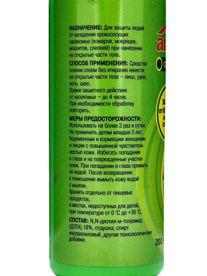 Описание:Для защиты людей от нападения кровососущих насекомых (комаров, мокрецов, москитов, слепней) при нанесении на открытые части тела.Способ применения:Средство тонким слоем без втирания нанести на открытые части тела - лицо, руки, ноги, шею. Время защитного действия от насекомых - до 4 часов. При необходимости обработку повторить.Действующие вещество: диэтилтолуамид - 18%