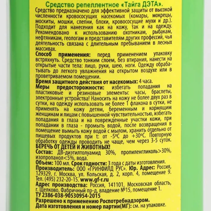 Спрей репеллентный от комаров "Тайга Дэта", 100 мл — Характеристики