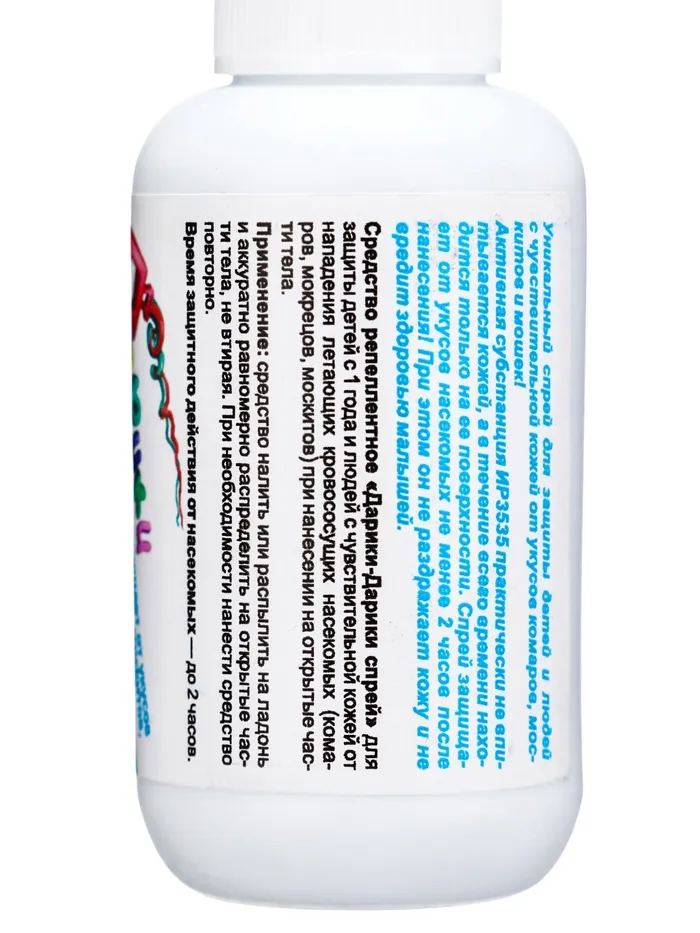 Средство репеллентное «Дарики-Дарики спрей» для защиты детей от 2 лет и людей с чувствительной кожей от нападения летающих кровососущих насекомых (комаров, мокрецов, москитов) при нанесении на открытые части тела.