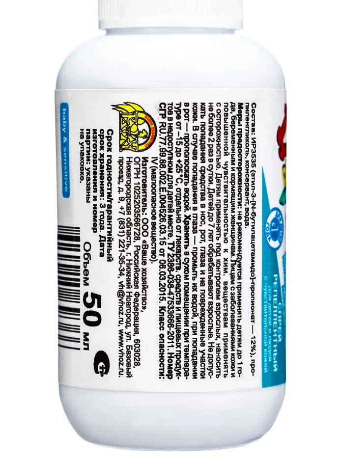 Меры безопасности: не рекомендуется применять детям до 1 года, беременным и кормящим женщинам. Детям применять под контролем взрослых, наносить не более 2 раз в сутки. Детей до 7 лет обрабатывают взрослые.