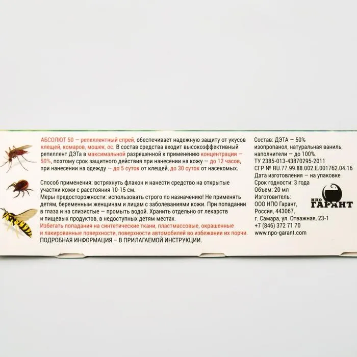 Назначение: репеллентный спрей.Характеристика: Репеллентный спрей, обеспечивает надежную защиту от укусов клещей, комаров, мошек, ос. В состав средства входит высокоэффективный репеллент ДЭТА в максимальной разрешонной к применению концентрации – 50%, поэтому срок защитного действия при нанесении на кожу – до 12 часов, при нанесении на одежду – до 5 суток от клещей, до 30 суток от насекомых.Благодаря высшей категории эффективности, Абсолют 50 особо рекомендуется к применению профессиональным контингентом: нефтяникам, геологам, строителям, газовикам, работникам лесных хозяйств, а также охотникам, рыбакам, активным путешественникам.Флакон - «ручка» 20 мл - легко размещается и крепится при помощи держателя-фиксатора на одежде, в карманах сумок и рюкзаков. Объема средства достаточно для надежной защиты при длительном пребывании на природе при однократном и — при необходимости — повторном нанесении.Способ применения: Встряхнуть флакон и нанести на открытые участки кожи с расстояния 10-15 см.Меры предосторожности: Использовать строго по назначению! Не применять детям беременным женщинам и лицам с заболеваниями кожи. При попадании глаза и на слизистые – промыть водой. Хранить отдельно от лекарств и пищевых продуктов, в недоступных детям местах. Избегать попадания на синтетические ткани, пластмассовые, окрашенные и лакированные поверхности, поверхности автомобилей во избежание их порчи.Действующее вещество: ДЭТА – 50%, изопропанол, натуральная ваниль, наполнители – до 100%.