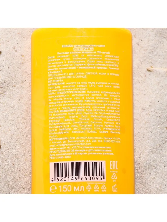 Спрей солнцезащитный "Krasa", водостойкий, SPF 40, 150 мл — Характеристики