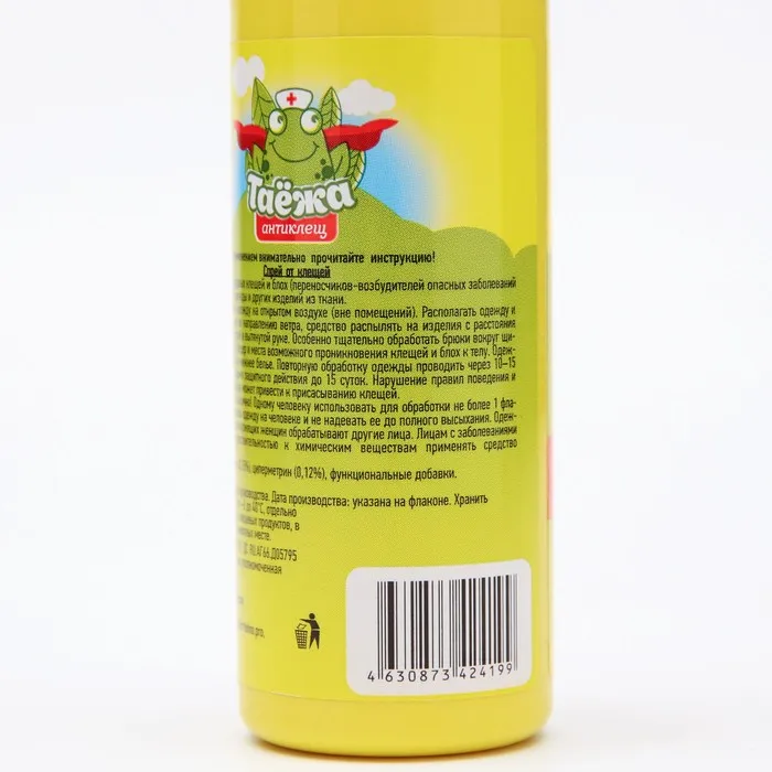 Способ применения: обрабатывать одежду на открытом воздухе (вне помещений). Располагать одежду и направлять струю средства по направлению ветра, средство распылять на изделия с расстояния 20-25 см от них, держа спрей в вытянутой руке. Особенно тщательно обработать брюки вокруг щиколоток, голеней, коленей, бедер и места возможного проникновения клещей и блох к телу. Одежду просушить и надевать на нижнее белье. Повторную обработку одежды проводить через 10-15 суток или после стирки. Время защитного действия до 15 суток. Нарушение правил поведения и способа применения средства может привести к присасыванию клеща.