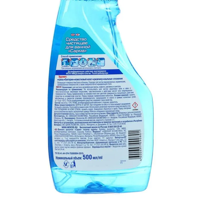 Средство Sarma прекрасно очищает различные поверхности ванной комнаты: унитазы, раковины, душевые кабины. Оно также подходит для кафеля и шкафчиков. Эффективно устраняет налёт и ржавчину.