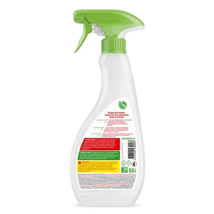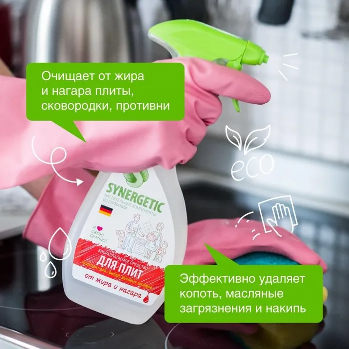 Биоразлагаемое средство для плит от жира и нагара SYNERGETIC - высокоэффективное щелочное средство для удаления жира, нагара, копоти, масляных пятен и накипи с плит и других кухонных поверхностей. Комплекс биоразлагаемых растительных тензидов и соды справляется с органическими загрязнениями за считанные минуты.